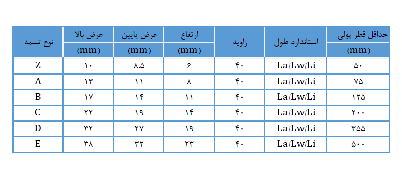 تسمه های V شکل با مقطع ذوزنقه ، دارای استاندارد سایزبندی بر اساس سطح مقطع می باشند .